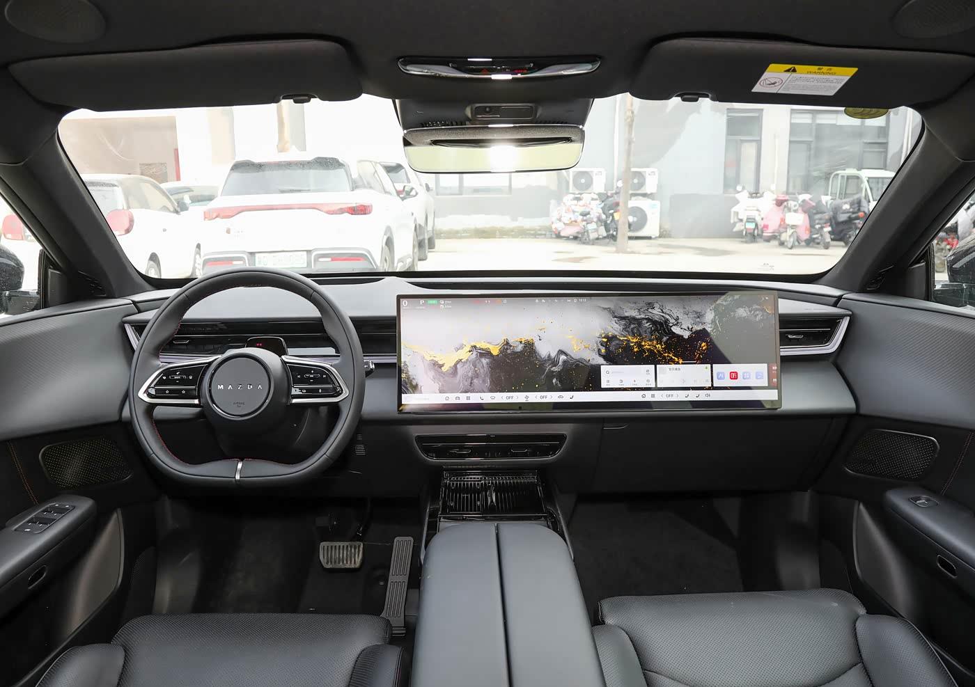 进入车内,内饰采用极简环抱式布局,以 “科技 + 舒适” 为核心,用料与质感越级。中控台搭载全球首款 26.45 英寸 5K 一体式大屏,9.5mm 超薄机身、6.4mm 极窄边框,显示清晰、操作流畅,搭配 100 英寸裸眼 3D HUD,解决传统 HUD “飘抖晃” 痛点,科技感直接拉满。三辐式真皮方向盘握感饱满,触控按键搭配拨片,操作便捷;车内大量软质搪塑、皮质包裹与金属饰条拼接,触感细腻。座椅是一大亮点,前排双零重力座椅支持 120° 平躺、16 向电动调节、8 种按摩及加热通风功能,久坐不累。空间表现越级,2902 毫米轴距带来后排膝部空间 122mm、腿部伸展空间 990mm,地板接近纯平,三人满载也不压抑。后备箱常规容积 350L,放倒后排可扩展至 2036L。