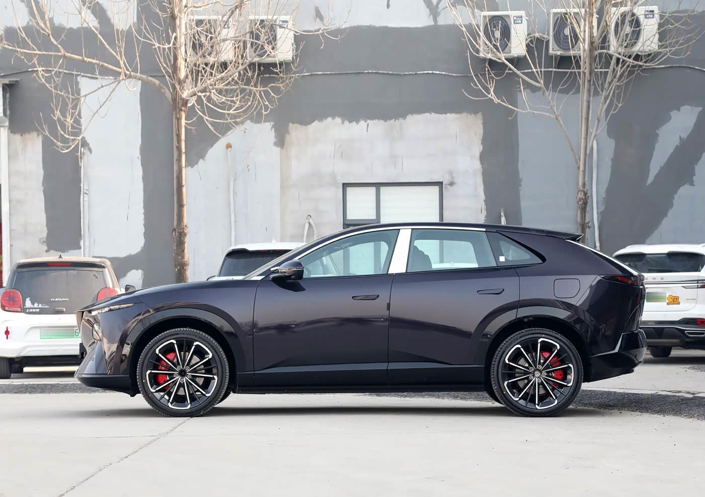 再来看车身侧面部分,EZ-60采用低重心俯冲姿态,溜背线条从车顶自然延伸至车尾,搭配悬浮式车顶与隐藏式门把手,勾勒出优雅动感的轿跑SUV姿态。4850/1935/1620mm的车身尺寸与2902mm的轴距,保证了车内空间的同时,又让车身比例显得修长协调。细节处的设计同样彰显用心,前后轮眉及车门下边缘采用亮黑色材质包覆,加入“MAZDA”英文标识,精致感十足。21英寸的大尺寸铝合金轮毂搭配低扁平比轮胎,进一步强化了运动气质。